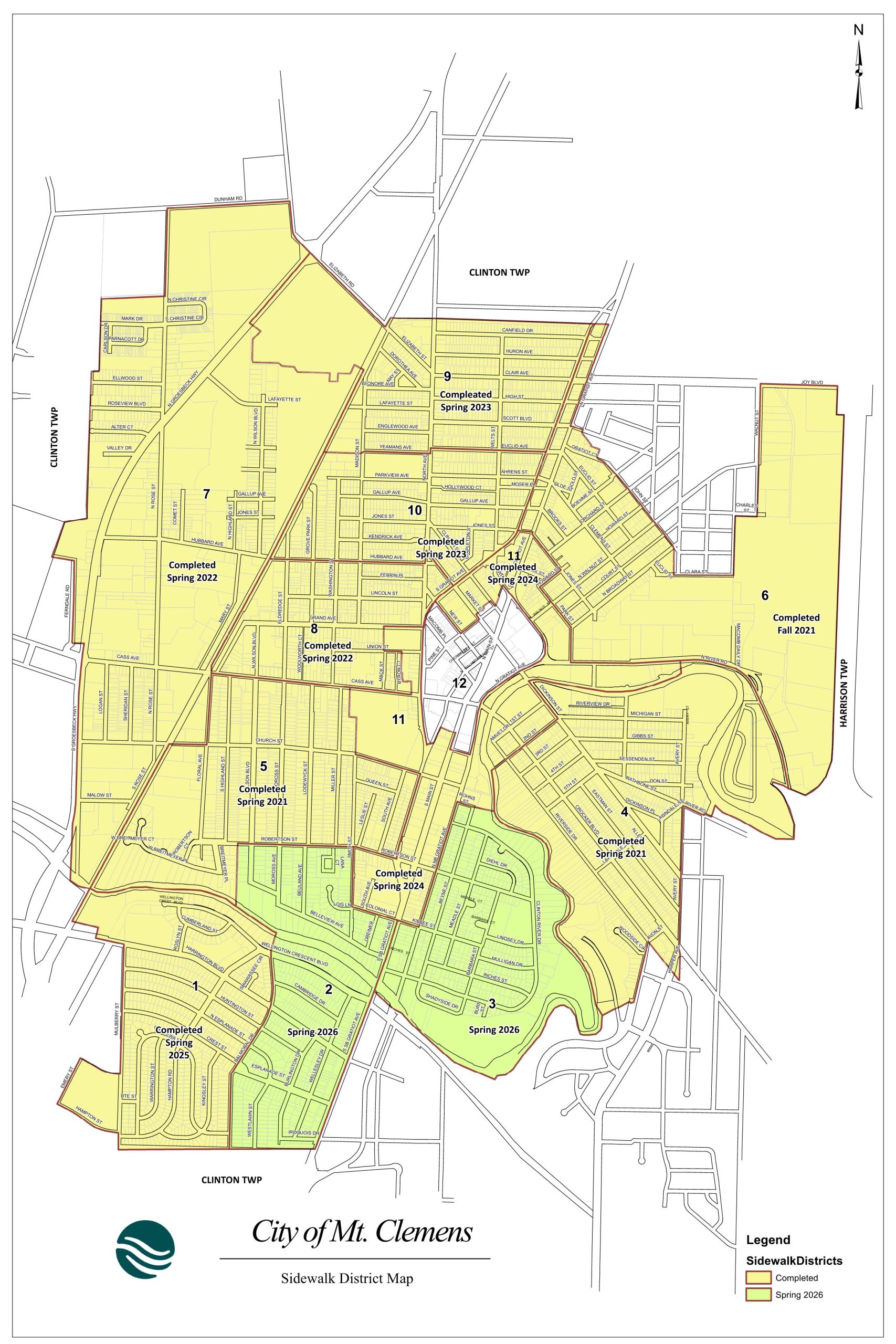The City of Mount Clemens Sidewalk Repair Program was established in 2017 by the City Commission. This program was developed to repair hazardous sidewalk within the public right of way throughout the City. The City was divided into ten districts, along with a Downtown District to equally divide sidewalk lengths, considering major roads, construction mobilization and geographic limitations. Sidewalk replacement began in District 1 during the 2017 construction season and will continue through the Districts in numerical order.